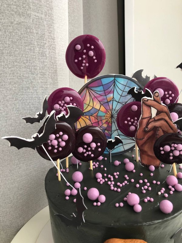 Окрашивала этим красителем шоколадный крем-чиз для торта и леденцы из изомальта для декора. Чёрный цвет всегда сложный, готовьтесь к тому, что красителя придётся добавлять очень много, без преувеличений — очень много, иначе яркий цвет не получить. В изомальт на 50г добавляла 3 капли красителя+пару капель диоксида, чтобы леденцы не были прозрачными, цвет получился глубокий, но на фото немного отдаёт тёмно-фиолетовым, скорее всего так кажется из-за обилия сиреневых и фиолетовых элементов на торте. Если хотите окрашивать крем, то 100% нужно красить шоколадный крем, потому что белый крем в чёрный превратить ну ооочень сложно. Я добавила очень много красителя, чуть ли не треть (а может и больше) тюбика вылила на 170г сыра, но он всё равно не был достаточно чёрным и пришлось пол ложки угля бамбукового еще добавить для плотности цвета. Для меня это рабочая схема — сочетать гелевый и сухой чёрный, тогда точно получается насыщенный цвет. А в целом краситель неплохой, но расход, конечно, будь здоров.