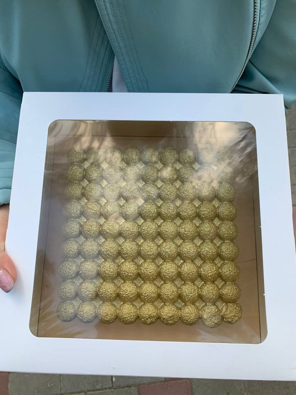 Коробка хорошая, много окошек. Круглая подложка встаёт очень плотно, квадратная 24х24 (усиленная) заходит достаточно туго, но зато не переживаешь, что торт будет ездить в разные стороны. Можно взять подложку на 22, разница с боков будет максимально мала.