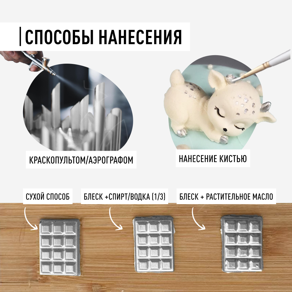 Подробнее о методах нанесения блеска вы можете посмотреть в видео - "Как использовать пищевой блеск Mixie".
