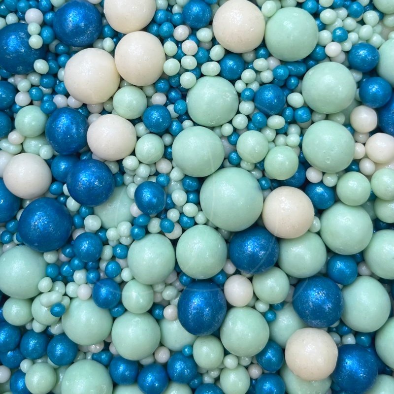 Жемчужная посыпка покрыта ярким пищевым блеском белого и бирюзового цвета.
