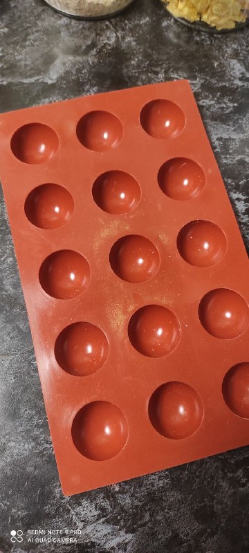 хорошая форма для полусфер. Силикон хороший. Пока только учусь делать полусферы и поэтому делаю их на глазури, до шоколада еще далеко. Единственное, имейте ввиду, что кандурин смыть тяжело. Поэтому лучше не наносить кандурин заранее на форму.