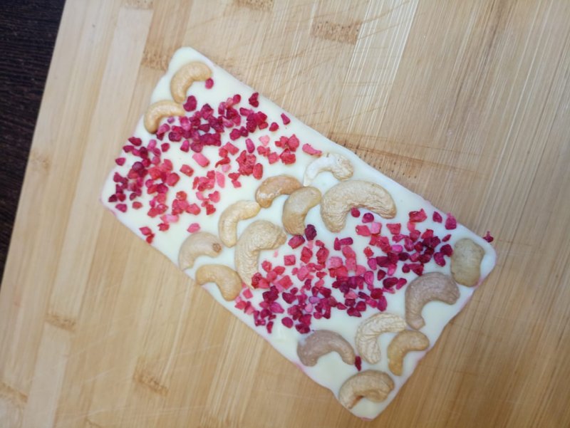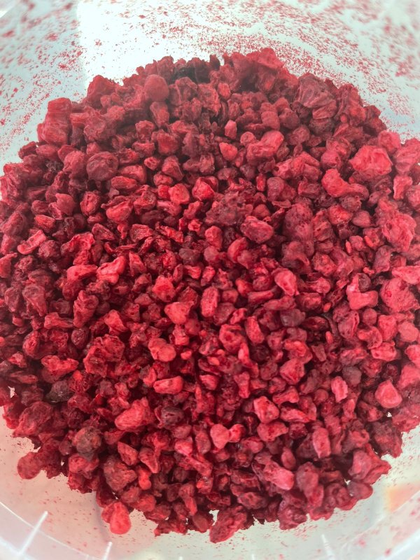 Очень удобная нарезка малины. Достаточно мелкая, но в то же время не очень сильно. Имеет немного кисловатый, но очень приятный вкус. Для шоколадок ручной работы подходит идеально.