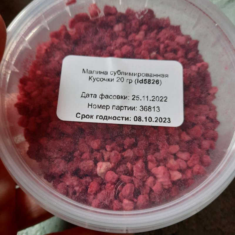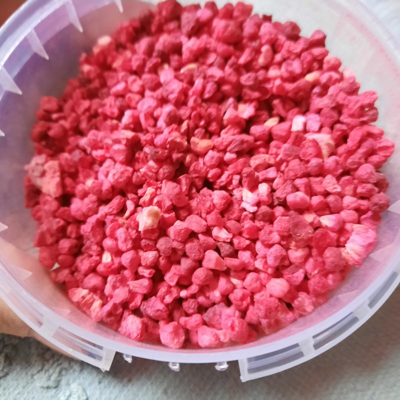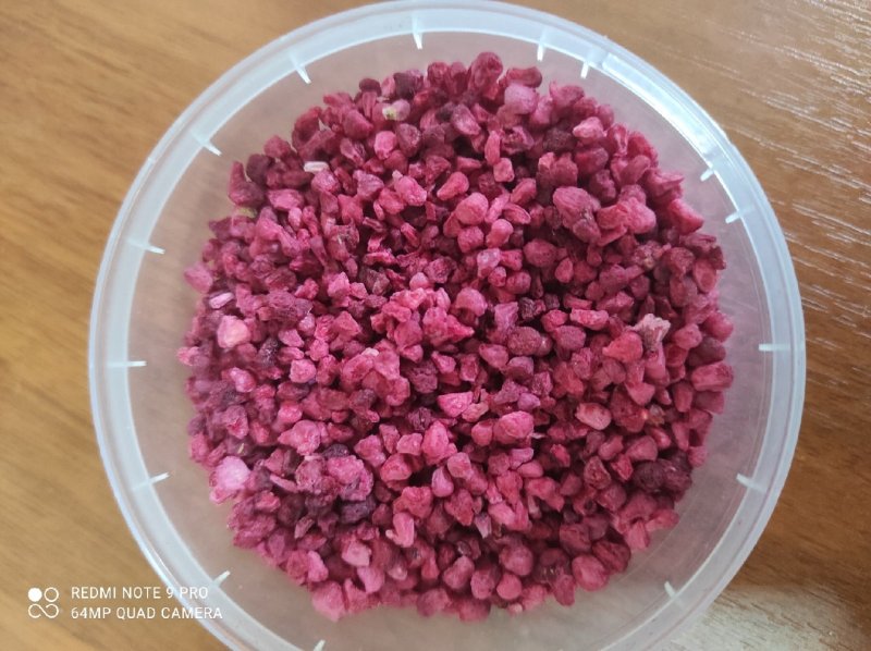 Чудесная малина! Люблю использовать для декора своих десертов вместо сахарной посыпки, украшаю макарон и шапочки капкейков красный бархат, очень красиво смотрится, а главное она приятная на вкус и запах! Фракция кусочков очень хорошая, не пудра, что еще один плюс этого ингредиента.