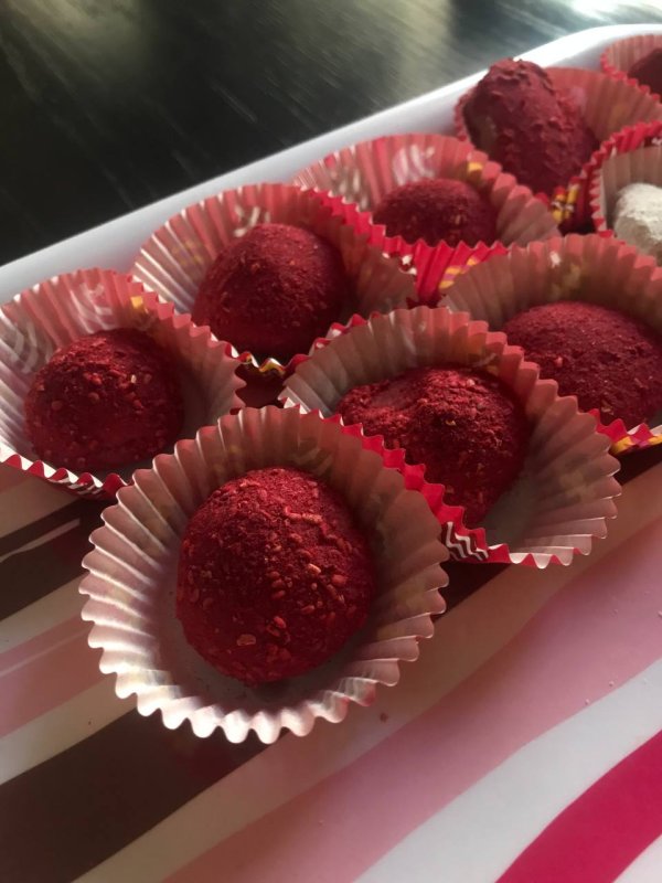 Маленькие, кисленькие кусочки малины хорошо подходят в крамбл, крема, бисквиты, маффины) Я ее растираю в пыль и обваливаю в ней трюфели из руби.