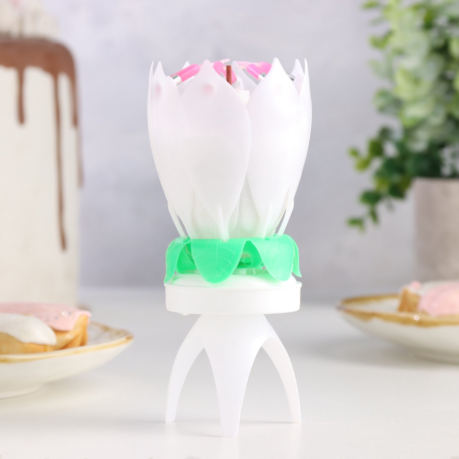 После этого цветок раскроется, загорится 8 дополнительных свечек, заиграет музыка, а тюльпан начнет вращение.